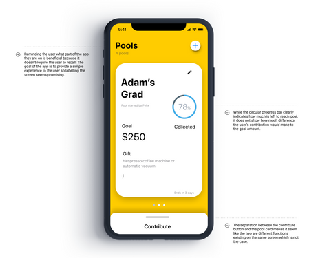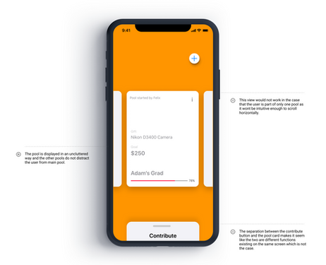 In the second iteration the exploration was narrowed down to a simple card view with a vertical scroll, based on the assumption that most people will not be part of more than a few pools at a given time. This decision allowed to further explore ways the user could interact with a particular pool card to contribute to it.